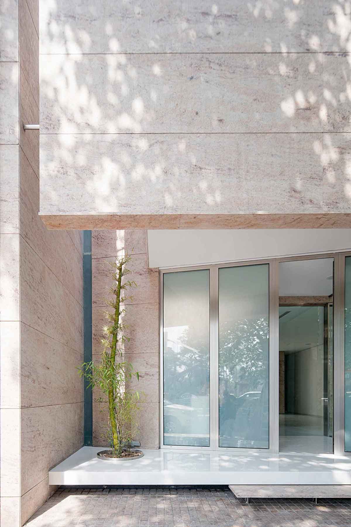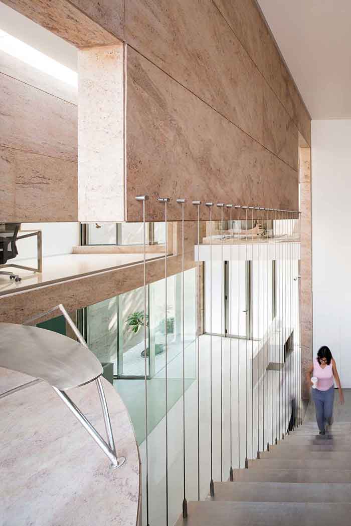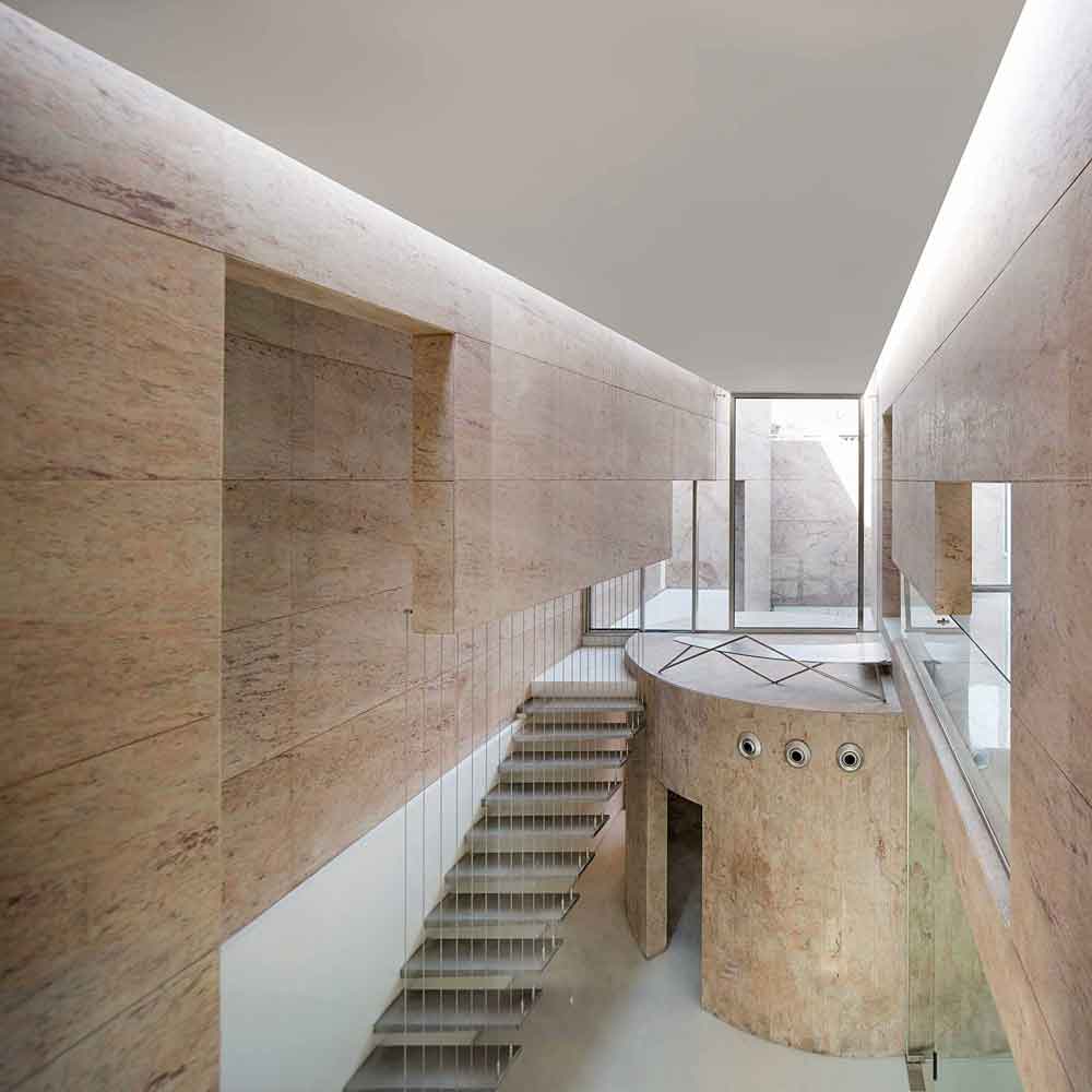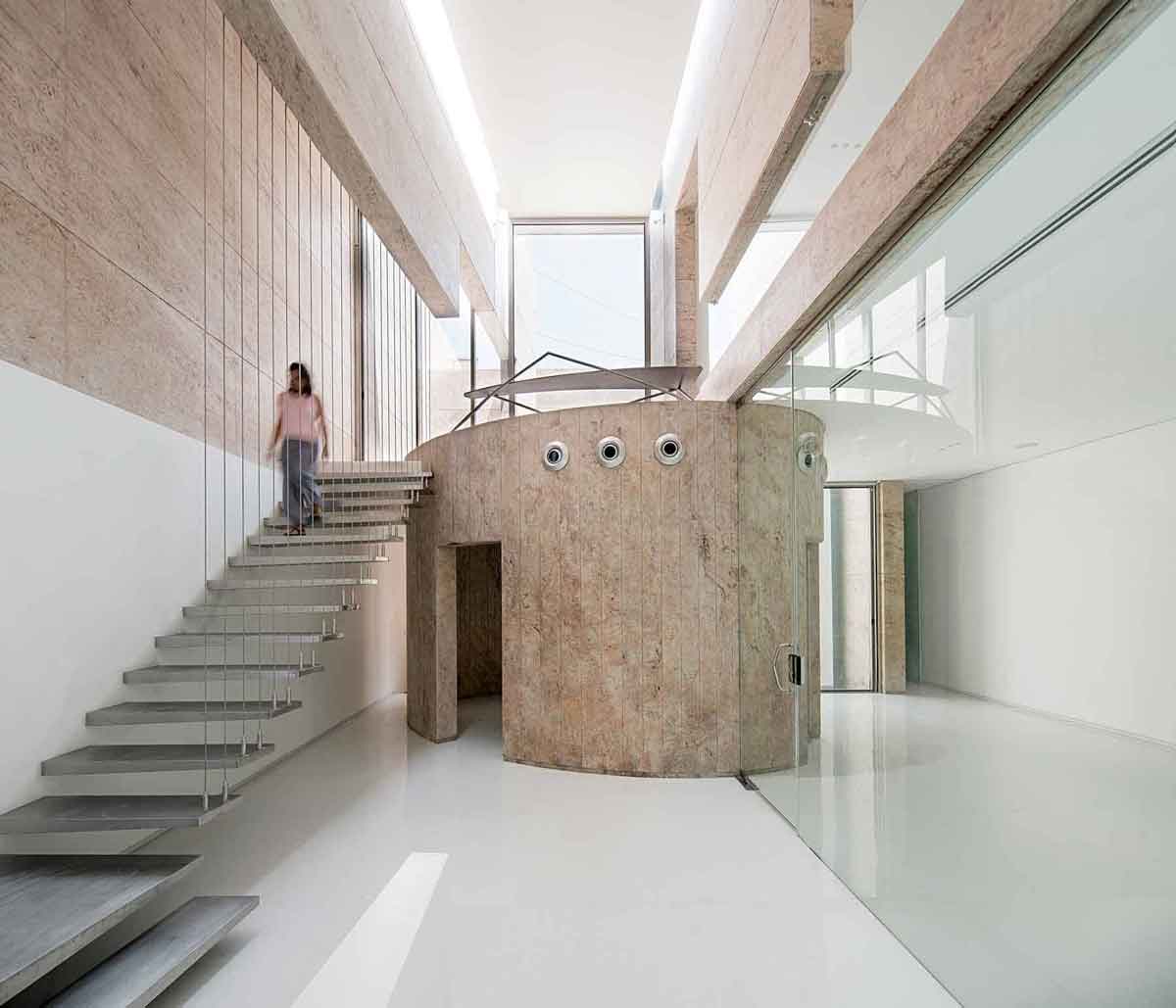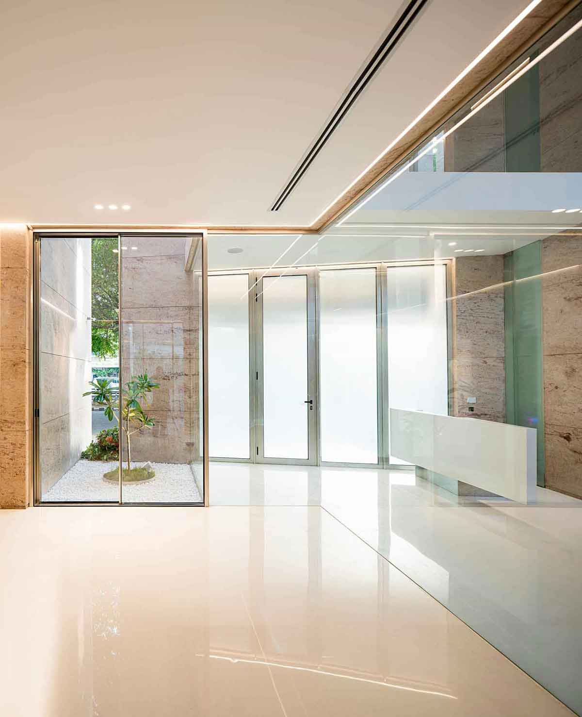 Designed to accommodate future expansion on the upper floors, the workspaces above are accessed by a separate staircase on the exterior. The material palette for the entire project is limited to white marble and Sivakasi gold granite, with the interior walls painted mostly white—contributing to a sense of seamlessness between the exterior and interior.