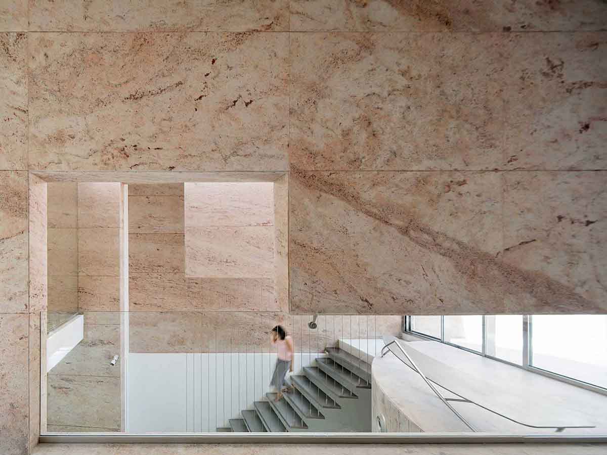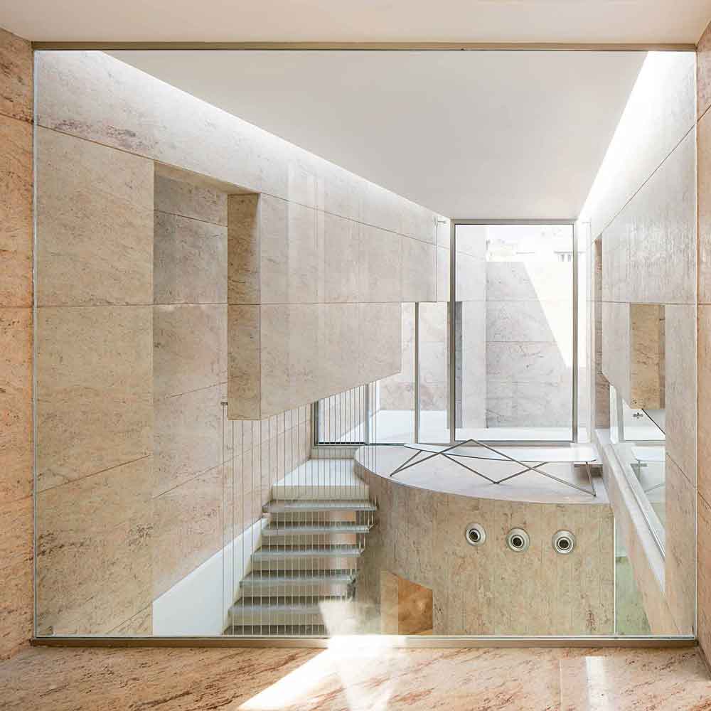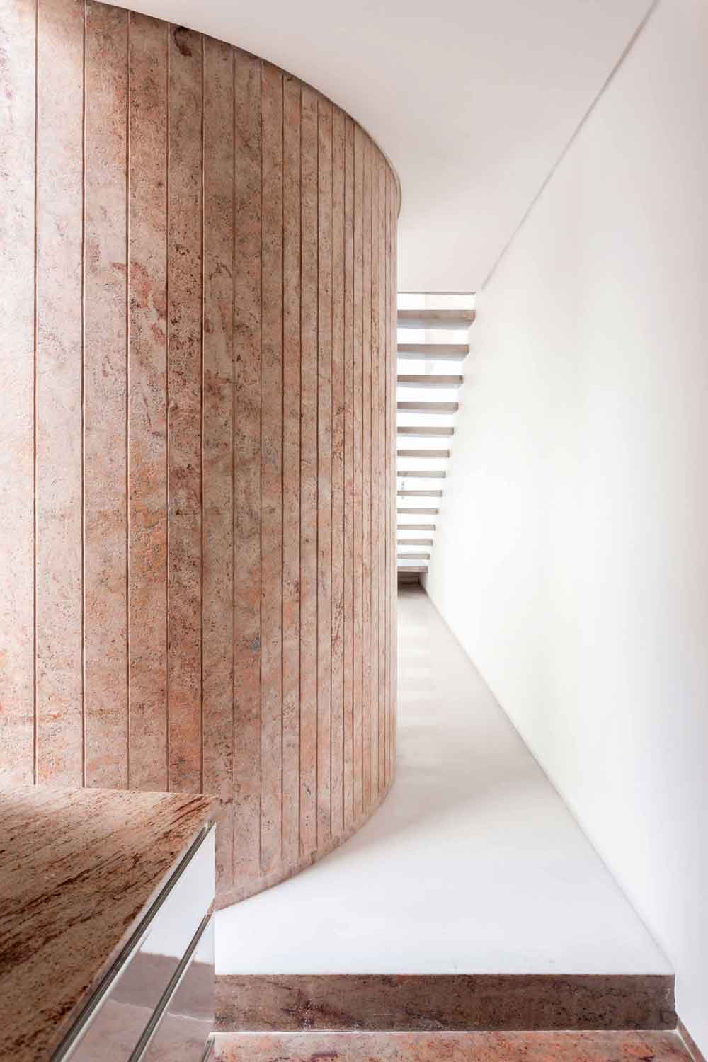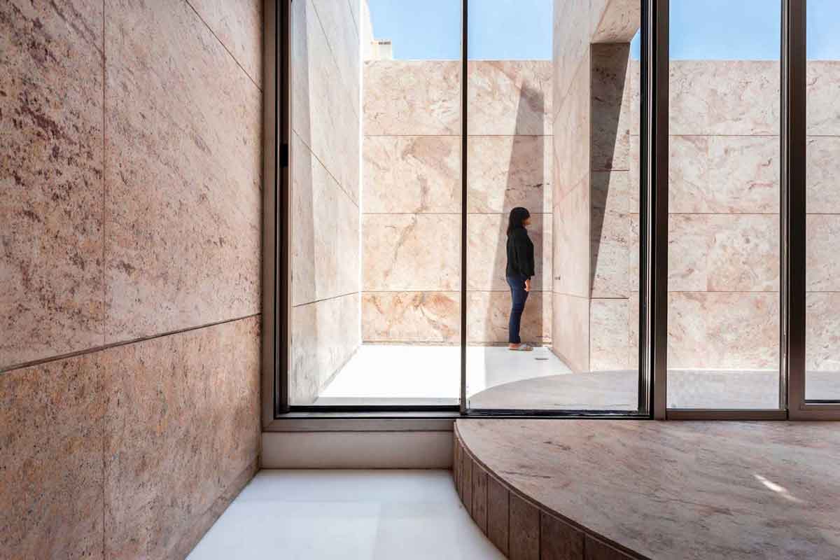 Designed to accommodate future expansion on the upper floors, the workspaces above are accessed by a separate staircase on the exterior. The material palette for the entire project is limited to white marble and Sivakasi gold granite, with the interior walls painted mostly white—contributing to a sense of seamlessness between the exterior and interior.