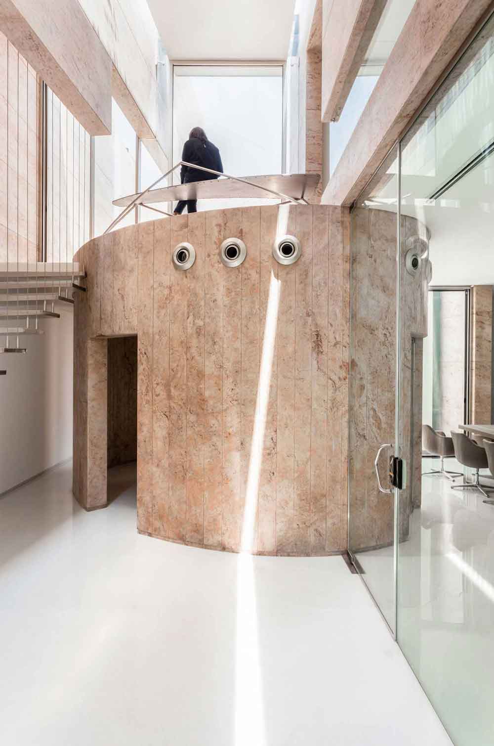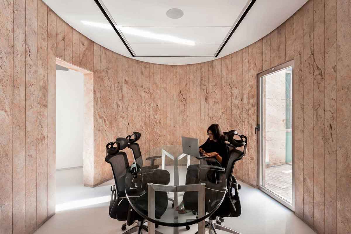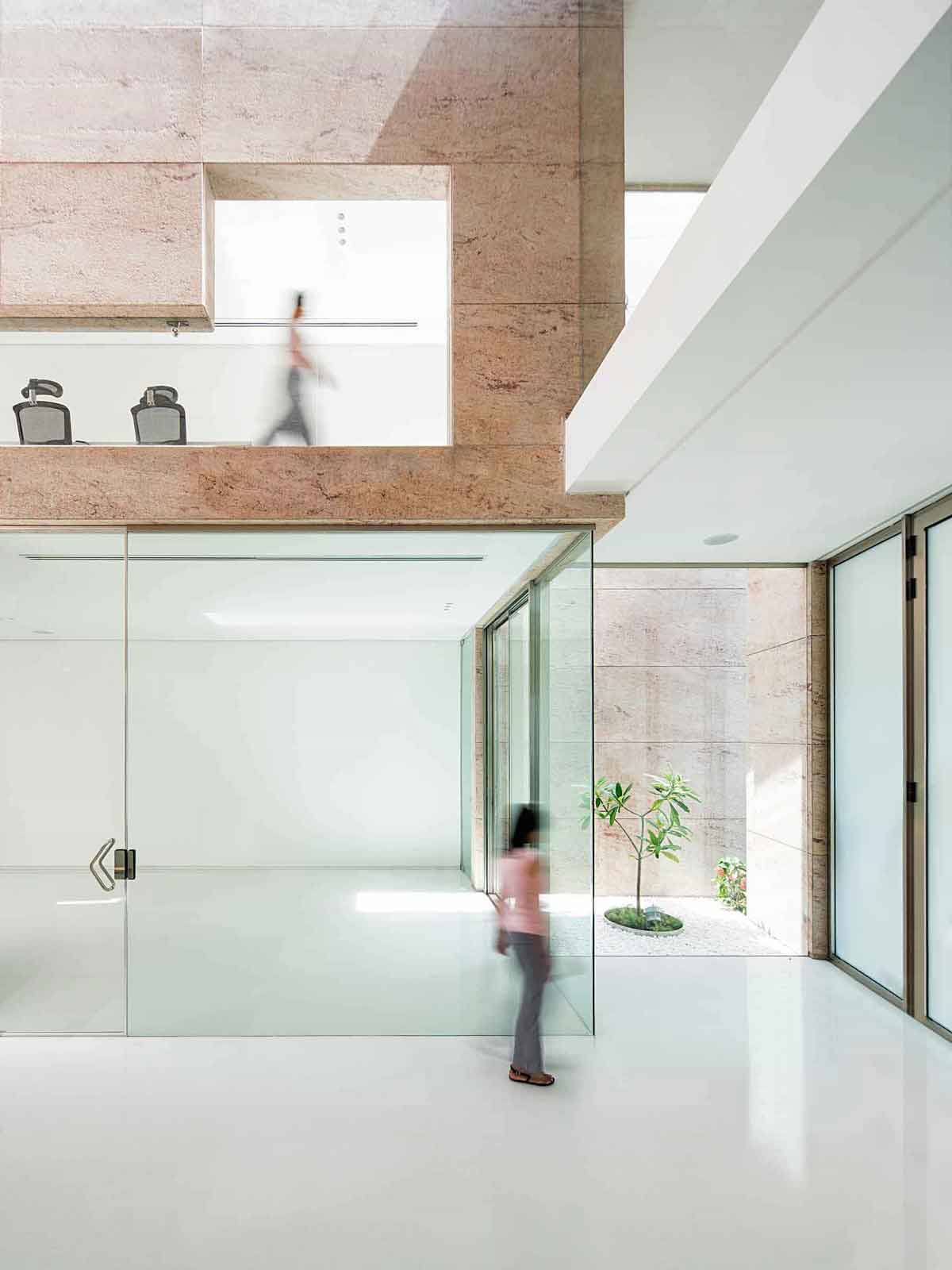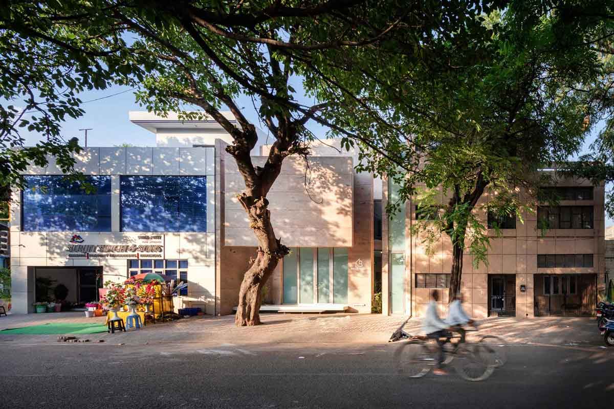 Office 543 was designed by Charged Voids on a tight, 140-sqm plot in a busy commercial district in Mohali, Punjab. The narrow building, closed from two sides, has openings through two courtyards and multiple skylights, thereby maintaining optimum daylight and ventilation.