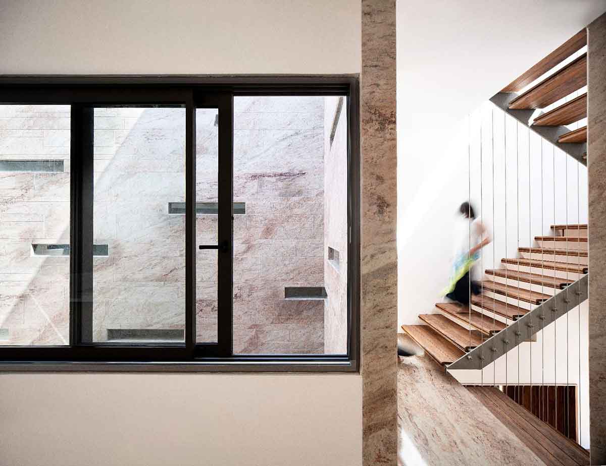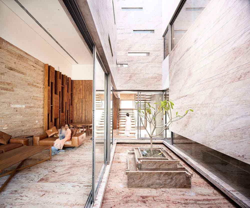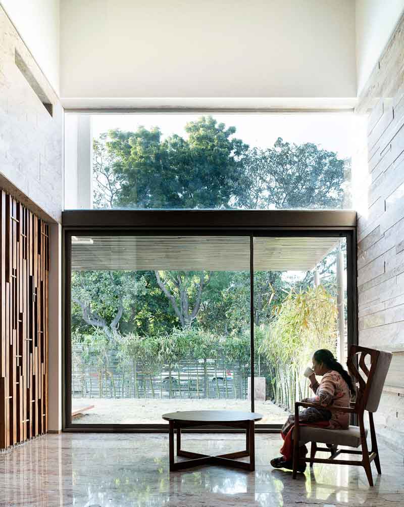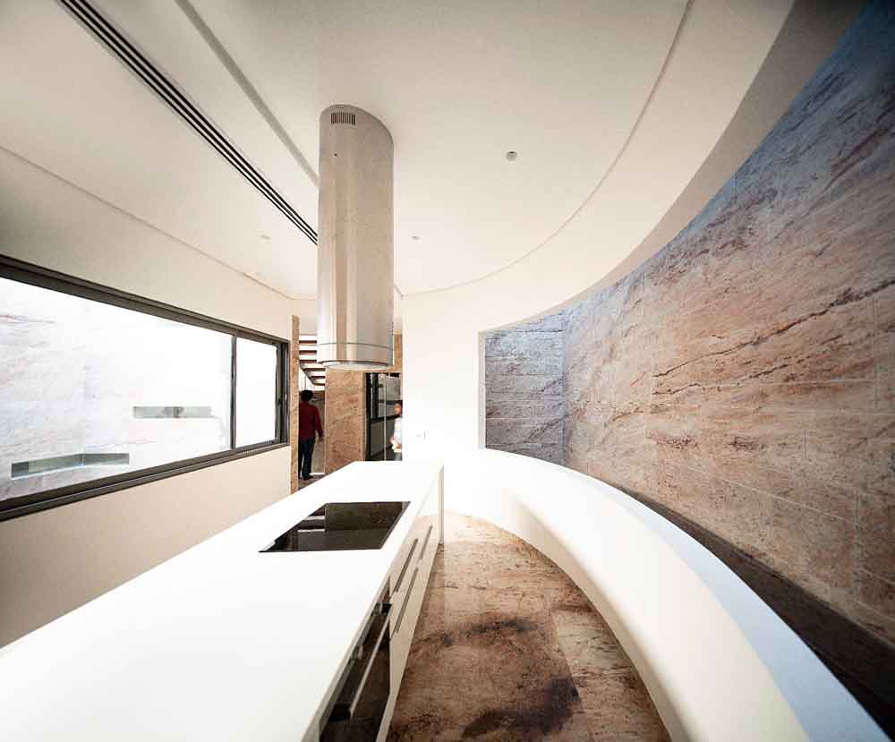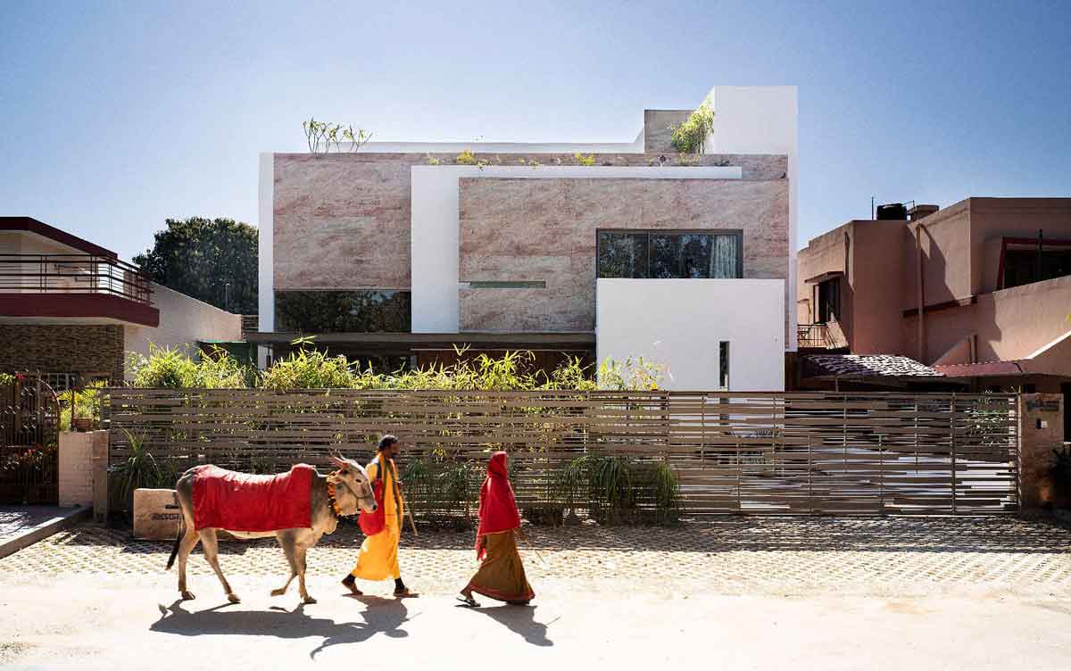 The home is designed to support and reinforce the interpersonal lifestyles of multigenerational, joint Indian households. Elements of nature—bright daylight through the skylights, floral fragrance, the gentle sound of quietly flowing water—are introduced with the intention of visually and spiritually invigorating the space and its occupants. With this project, Charged Voids endeavours to continue the search for the original form of space—imbibing the fundamentals of simplicity and efficiency while rejecting superfluous ornamentation.