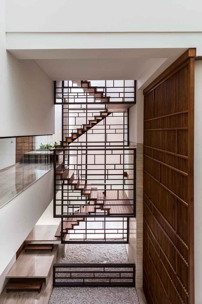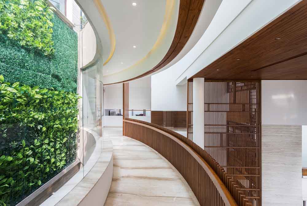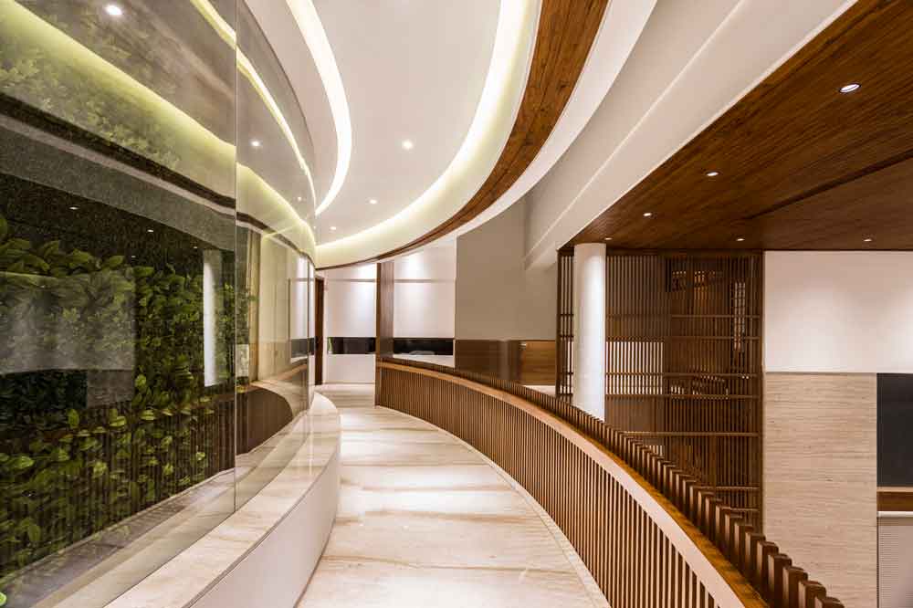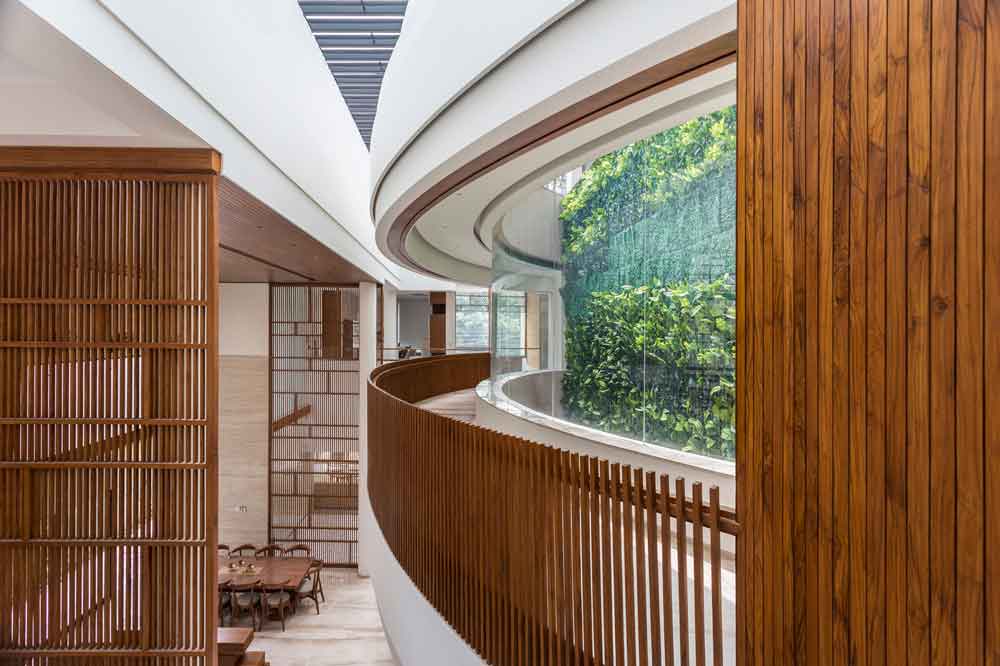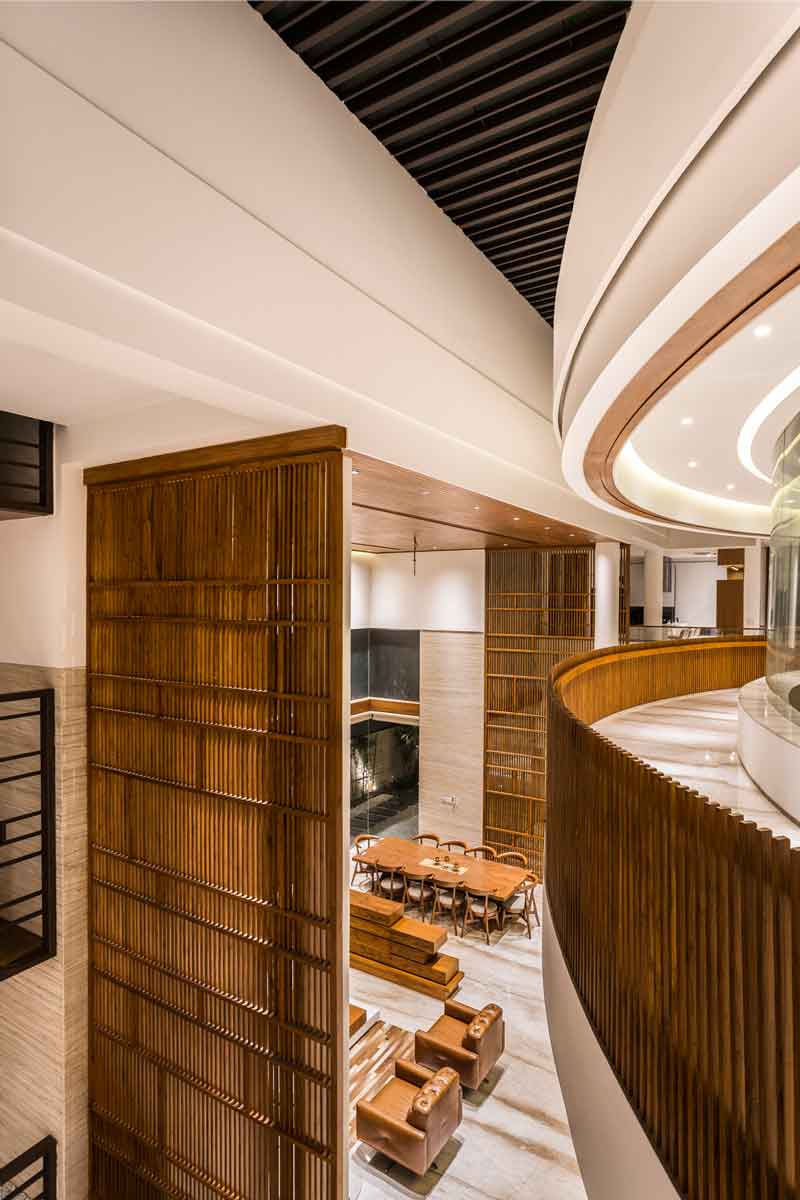 Inside the house, this connecting central space becomes the nexus around which the entire plan revolves. The grand, double-height doors open to let one into an equally grand double-height foyer. The open-to-sky courtyard also features two bridges that jut out from the wall and become the focal point of the design. The two cantilevered curved bridges in the central area are major architectural and sculptural elements of the house. These internal bridges lend a monumental air to the interiors, giving it the sheen of grandeur and also serving as the primary circulation routeson the first and second floors.