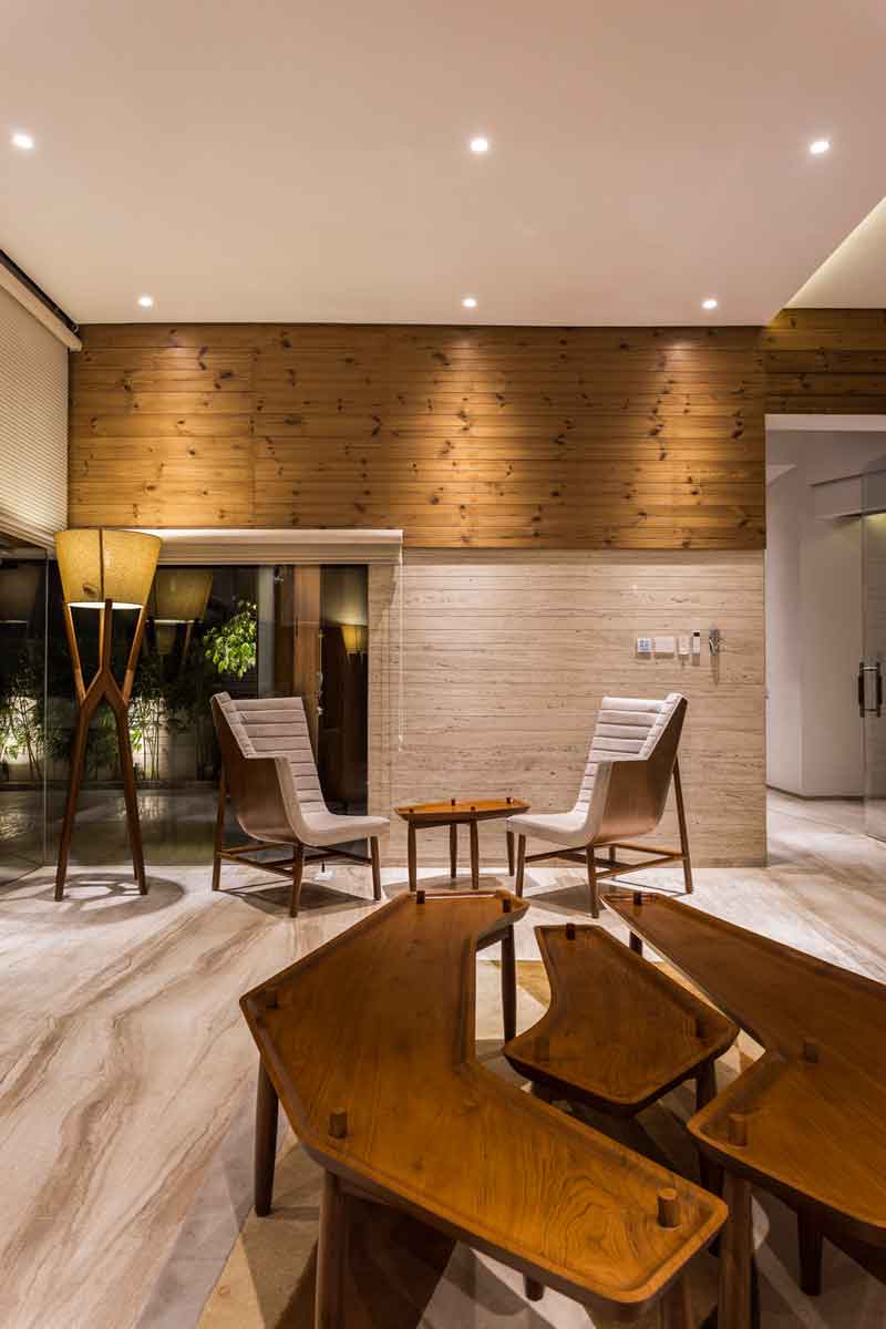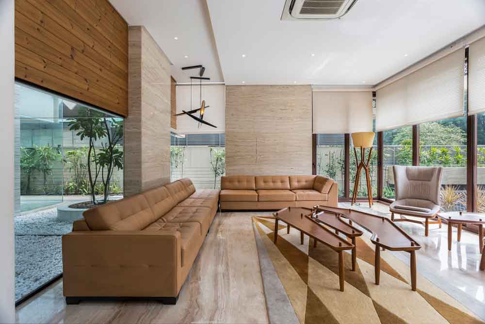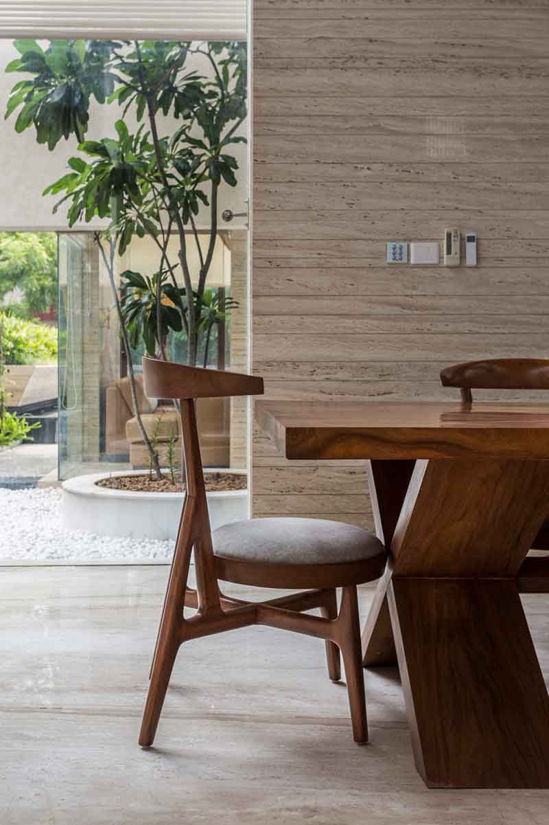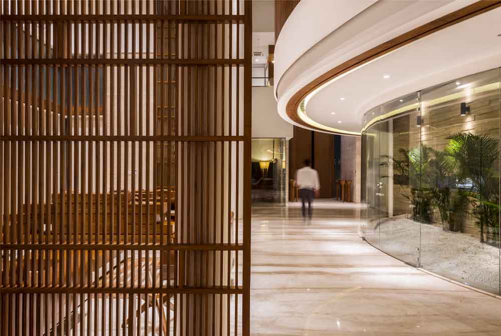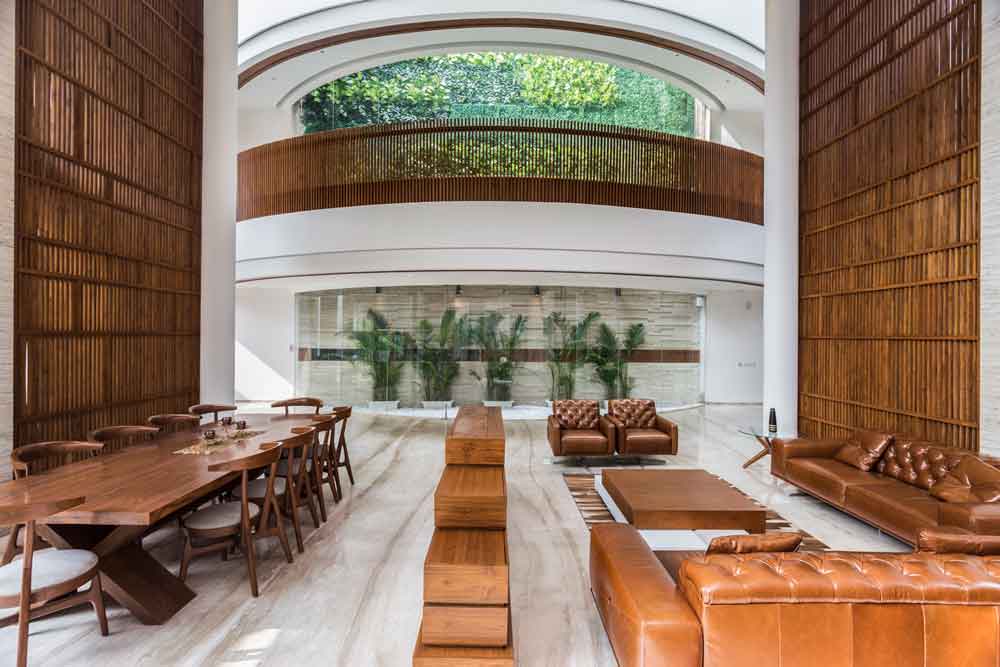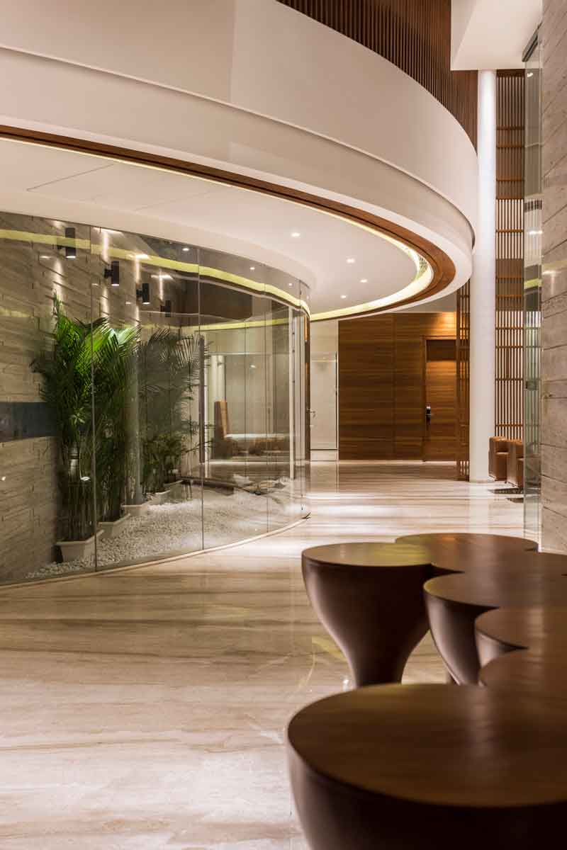 Inside the house, this connecting central space becomes the nexus around which the entire plan revolves. The grand, double-height doors open to let one into an equally grand double-height foyer. The open-to-sky courtyard also features two bridges that jut out from the wall and become the focal point of the design. The two cantilevered curved bridges in the central area are major architectural and sculptural elements of the house. These internal bridges lend a monumental air to the interiors, giving it the sheen of grandeur and also serving as the primary circulation routeson the first and second floors.