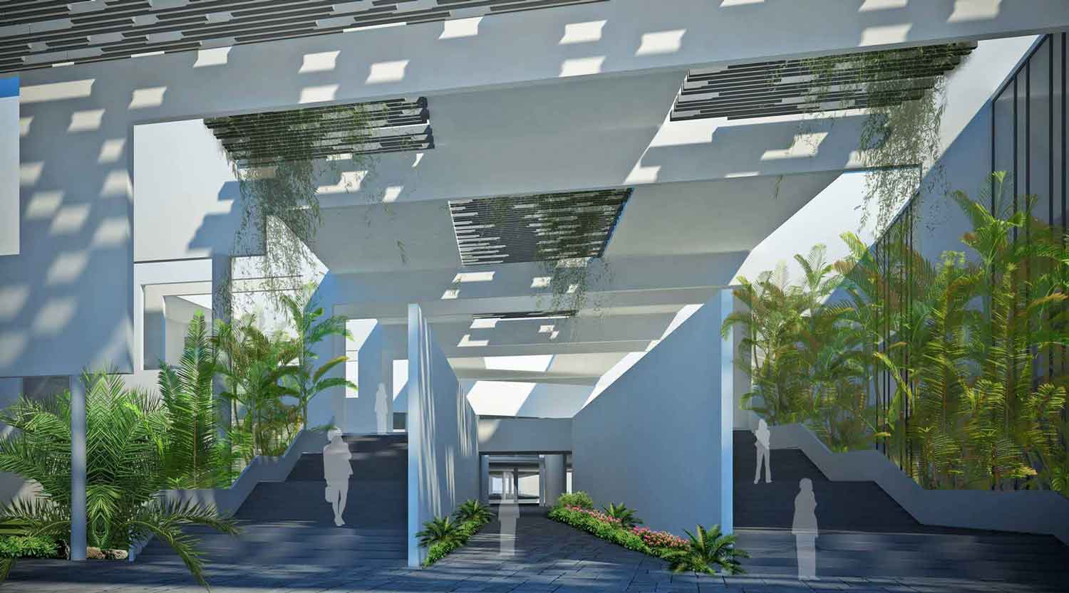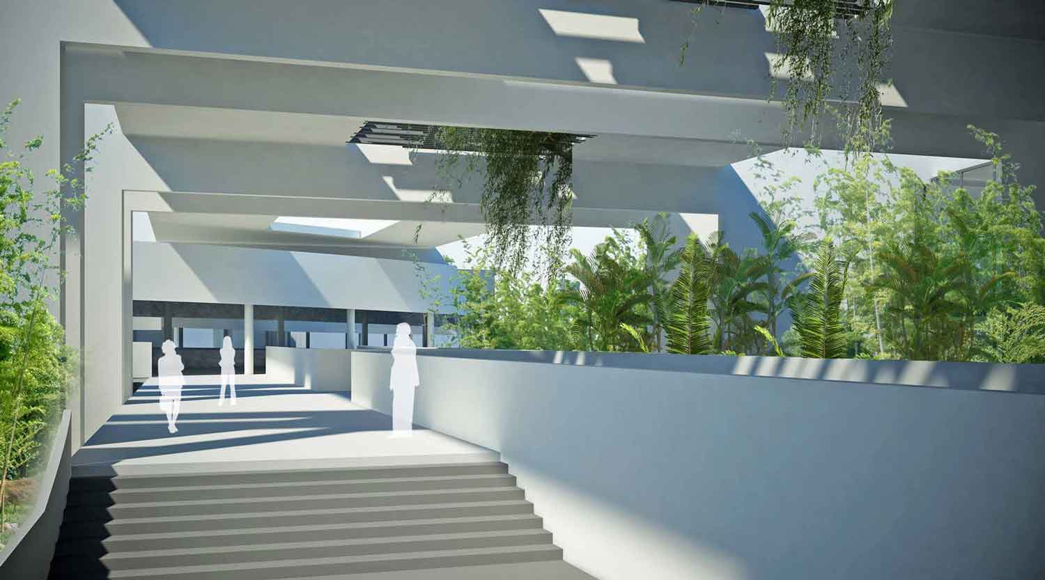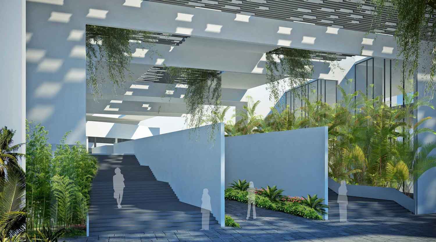 Located about 100km from the national capital, the design for this project was the winning entry for an architectural competition. The central idea was to design not just a building but create an environment conducive to learning and encouraging the informal exchange of ideas. The focus was thus not just on the built form but the spaces in between the various building blocks. This idea of creating intellectually stimulating spaces was realised on the basis of two aspects: the more the penetration of nature into the built form, the greater the freedom of circulation, and thus better would be the overall environment. The plan is organised along a main diagonal spine connecting the various buildings at both ground and upper levels.
